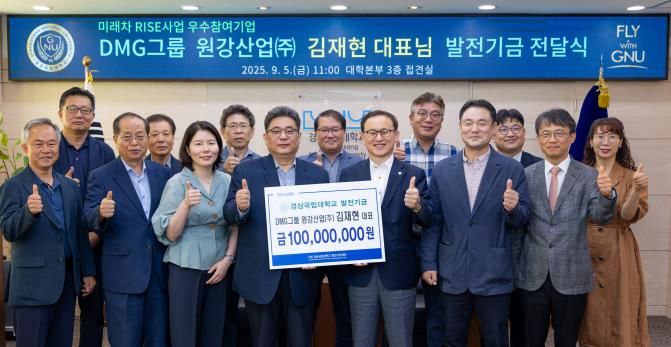 DMG그룹 원강산업(주)는 경상국립대학교에 현금 5000만 원과 현물 5000만 원을 기부하여 지역사회와 미래 인재 양성에 기여한다.