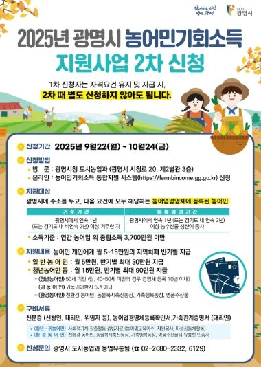 내고향뉴스 관리자 기자 | 광명시는 오는 22일부터 10월 24일까지 ‘2025년 2차 농어민 기회소득 지원사업’ 신청을 받는다.