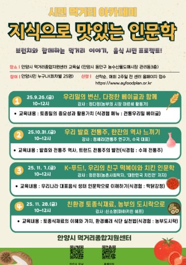 특강은 26일부터 센터 교육실(안양농수산물도매시장 관리동 3층)에서‘우리밀의 변신, 다정한 베이글과 함께’, ‘우리 발효, 전통주의 이해와 식경험’, ‘K-푸드, 떡볶이와 치킨 인문학 체험’, ‘토종 식재료, 농부의 도시락과 함께’의 주제로 총 4회에 걸쳐 진행된다.