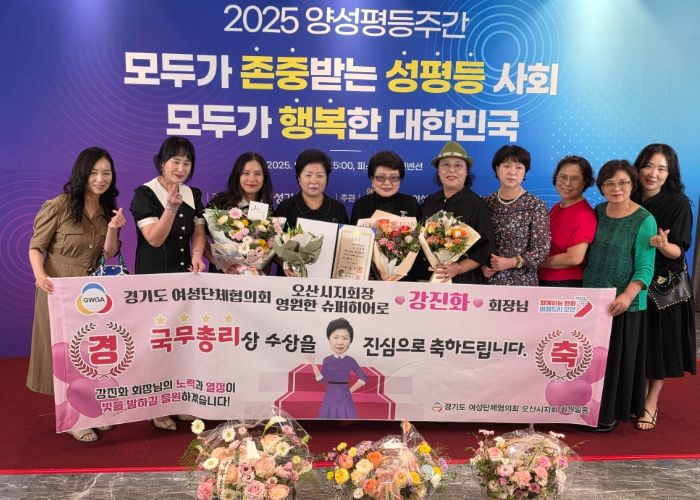 내고향뉴스 관리자 기자 | 오산시는 지난 9월 4일 서울 용산 피스앤파크 컨벤션에서 열린 '2025년 양성평등주간 기념식'에서 사)경기도여성단체협의회 오산시지회 강진화 회장이 양성평등진흥 유공으로 국무총리 표창을 수상했다고 밝혔다.