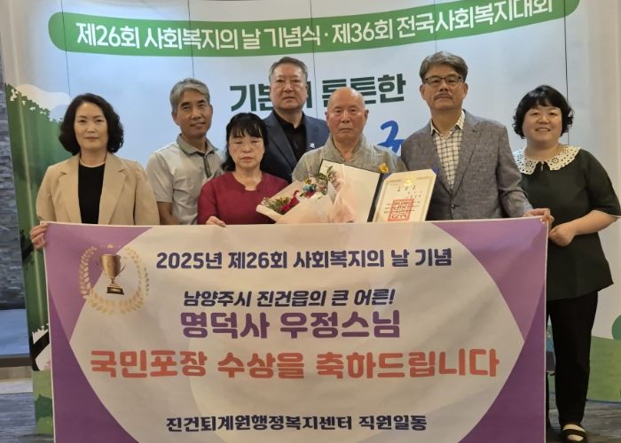 문흥기 진건퇴계원행정복지센터장은 “우정스님의 국민포장 수상은 개인의 영예를 넘어 지역사회의 큰 자랑”이라며 “이번 수상을 계기로 나눔과 봉사의 문화가 더 확산되길 기대한다”고 말했다.