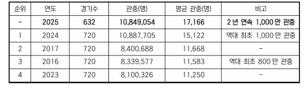 내고향뉴스 고광만 기자 | KBO 리그가 단일 시즌 역대 최다 관중 신기록 수립을 눈앞에 두고 있다. 9월 4일(목)까지 KBO 리그는 632경기만에 1,084만 9,054명의 관중이 야구장을 찾아 기존 단일 시즌 최다 관중 기록이었던 2024시즌의 1,088만 7,705명에 3만 8,651명을 남겨 뒀다. 출범 첫 시즌이었던 1982년 총 143만 8,768명의 관중으로 시작했던 KBO 리그는 마흔 네번째 시즌 만에 2년 연속 1,000만 관중을 넘어서는 프로스포츠 리그로 성장했다.