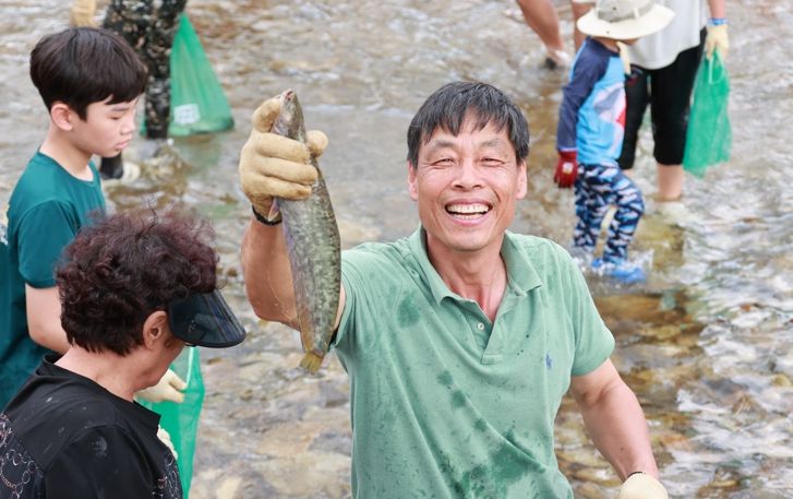 이날 군은 메기와 잉어 등 물고기 1만 5천 마리를 방류했으며, 아이부터 어른까지 참가자들은 주저 없이 냇물 속으로 뛰어들어 맨손으로 물고기 잡이에 나섰다.