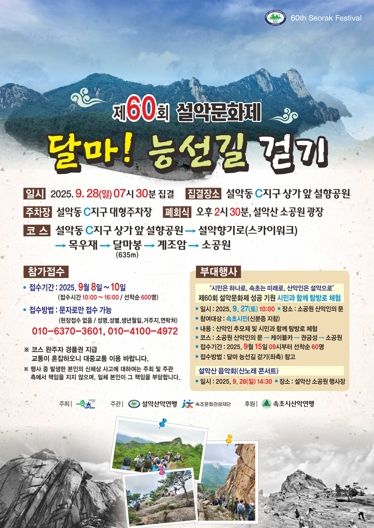 대표 행사인 '달마! 능선길 걷기'는 9월 28일 오전 7시30분 설악동 C지구 설향공원에 집결, 설악향기로(스카이워크)를 지나 달마봉을 오르는 코스로 진행된다.