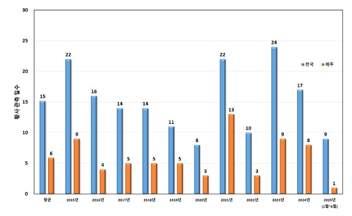 내고향뉴스 고광만 기자 | 제주특별자치도 보건환경연구원은 올해 상반기 제주지역 황사 관측일수가 1일에 그쳐 지난해 같은 기간 8일 대비 크게 감소했다고 밝혔다.