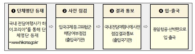 등록된 국내 전담여행사는 단체관광객 입국 24시간 전(선박 이용 시 입국 36시간 전)까지 단체관광객 명단을 하이코리아 누리집에 일괄 등재하면 된다.