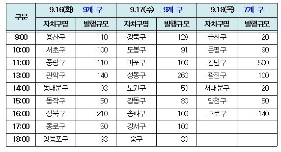 시는 원활한 상품권 구매를 위해 오는 16일부터 3일간 나누어 발행해 동시 구매자를 최대한 분산한다. 용산·서초구 등을 시작으로 9개 자치구 상품권은 오는 16일에, 강북·도봉구 등 9개 자치구 상품권은 17일에, 금천·은평구 등 7개 자치구 상품권은 18일에 구매할 수 있다.