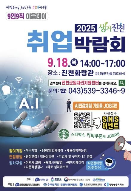 내고향뉴스 고광만 기자 | 충북 진천군은 오는 18일 오후 2시 군 화랑관에서 300여 개의 다양한 일자리를 제공하는 ‘2025년 생거진천 취업박람회’를 개최한다고 밝혔다.
