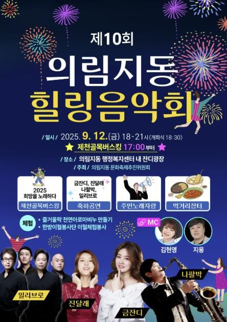 내고향뉴스 고광만 기자 | 의림지동 한여름 밤의 주민잔치 “제10회 의림지동 힐링음악회”가 오는 12일 저녁 6시 의림지동행정복지센터 잔디광장에서 개최된다.