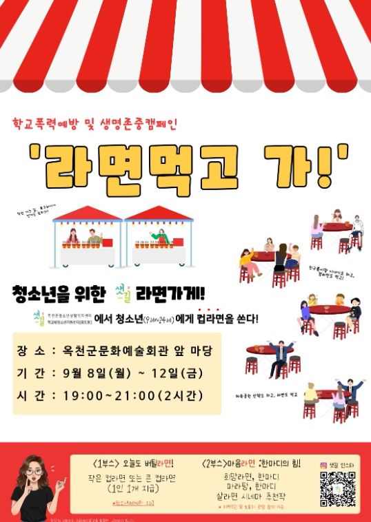 내고향뉴스 고광만 기자 | 옥천군청소년상담복지센터와 옥천군학교밖청소년지원센터는 청소년의 건강한 성장을 지원하기 위해 ‘생명존중 및 학교폭력예방 캠페인 '라면 먹고 가'’를 9월 8일부터 12일까지 매일 저녁 7시부터 9시에 옥천군문화예술회관 앞마당에서 개최한다.
