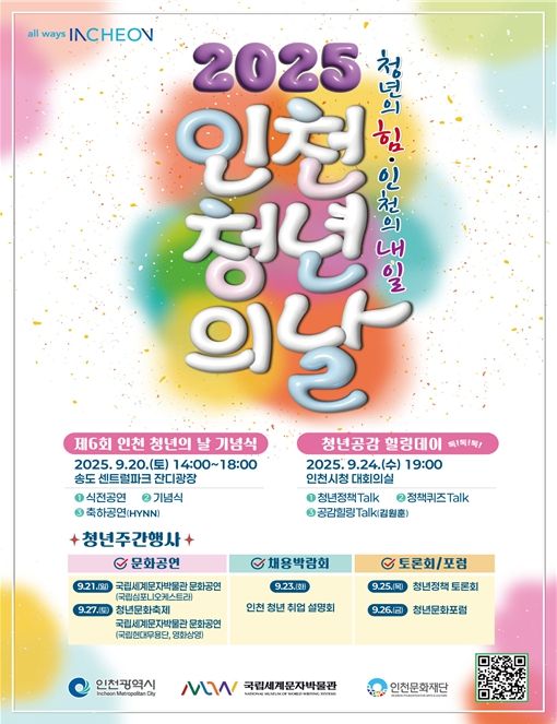 내고향뉴스 고광만 기자 | 인천광역시는 9월 20일부터 27일까지 ‘2025년 인천 청년주간’을 운영하며 ‘청년의 힘! 인천의 내일’을 주제로 청년과 시민 모두가 함께하는 축제의 장을 마련한다고 밝혔다.