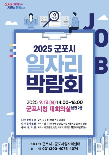 내고향뉴스 고광만 기자 | 군포시는 오는 9월 18일 오후 2시, 군포시청 대회의실에서 ‘2025년 하반기 군포시 일자리 박람회’를 개최한다. 이번 박람회는 지역 내 우수 기업과 구직자가 직접 만나는 채용의 장으로 일자리 기회를 제공할 예정이다.