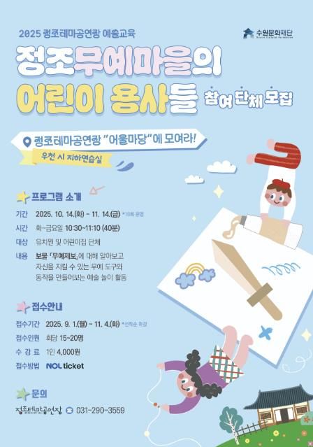 내고향뉴스 고광만 기자 | 수원문화재단은 오는 10월 14일부터 11월 14일까지 정조테마공연장 어울마당에서 ‘2025 정조테마공연장 예술교육 '정조무예마을의 어린이 용사들'’을 진행한다.