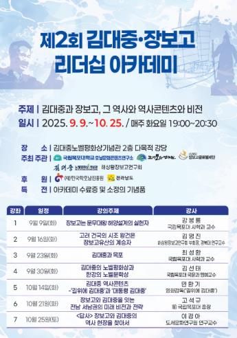 내고향뉴스 고광만 기자 | (재)김대중노벨평화상기념관은 오는 9일부터 *‘김대중과 장보고, 그 역사 및 역사콘텐츠와 비전’을 주제로 '2025 김대중·장보고 리더십 아카데미'를 개최한다.