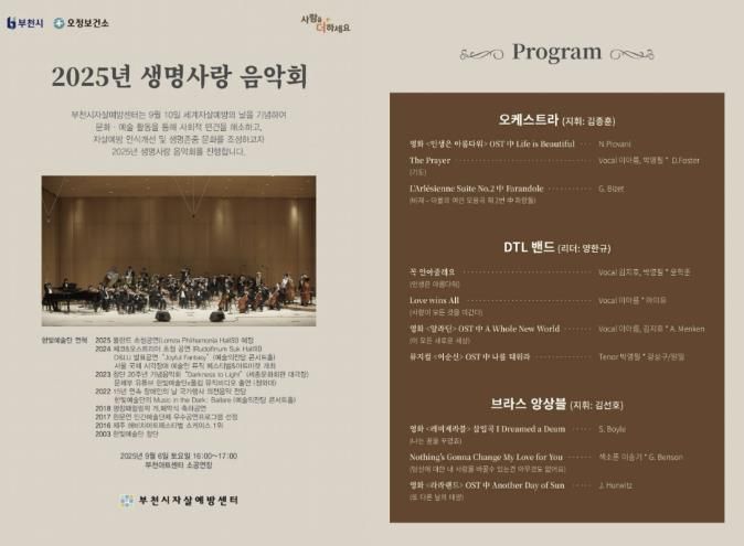 한편 부천시는 이번 음악회에 이어 9월 13일 부천중앙공원에서 ‘생명사랑 희망나눔 캠페인’을 열 예정이다. 이와 함께 부천시자살예방센터는 앞으로도 생명존중 문화 확산을 위한 시민 인식개선 활동을 지속적으로 추진해 나갈 계획이다.