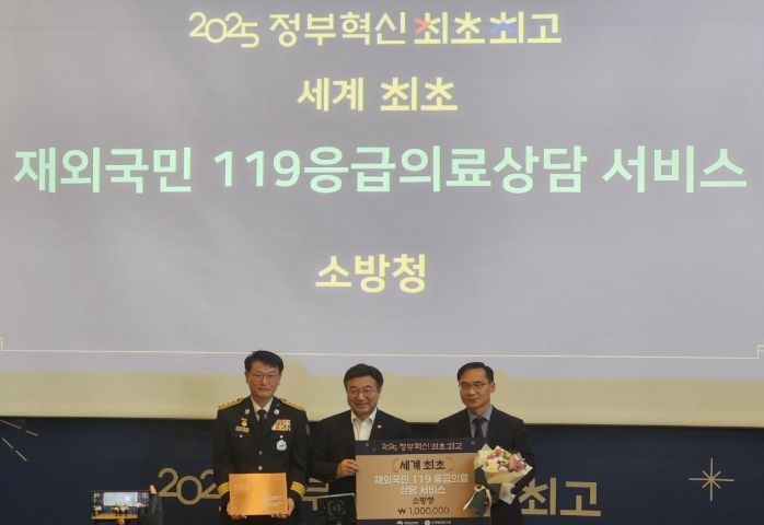 내고향뉴스 고광만 기자 | 소방청은 2일, 행정안전부와 한국행정연구원이 공동 주관한 2025'제4회 정부혁신 최초·최고' 시상식에서 ‘재외국민 119응급의료상담서비스’가 세계 최초 혁신사례로 선정되는 영예를 안았다고 밝혔다.