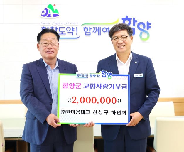 내고향뉴스 고광만 기자 | 함양군은 8일 오전 ㈜한마음테크의 천상구 대표이사가 함양군청을 방문하여 고향사랑기부금 200만 원을 전달했다고 밝혔다.