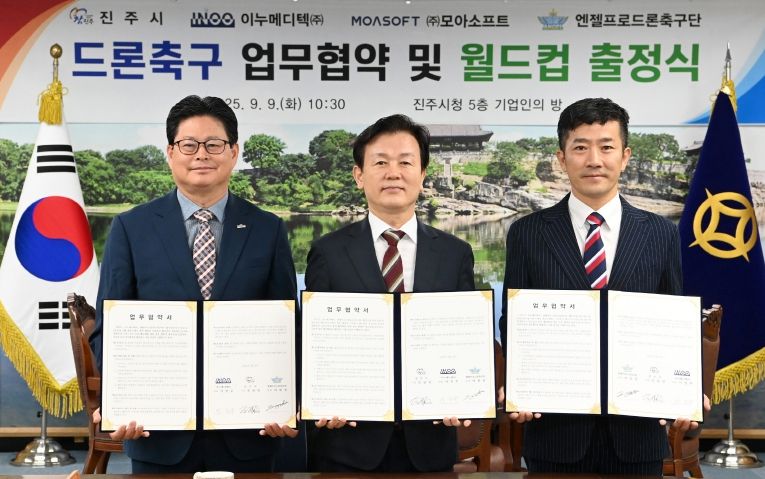 내고향뉴스 고광만 기자 | 진주시는 9일 오전 10시30분 시청 5층 기업인의 방에서 이누메디텍㈜, 엔젤드론축구단과 함께 드론축구 활성화를 위한 3자 업무협약(MOU)를 체결하고 ‘2025 전주 드론축구 월드컵’에 참가하는 엔젤드론축구단의 출정식을 가졌다.