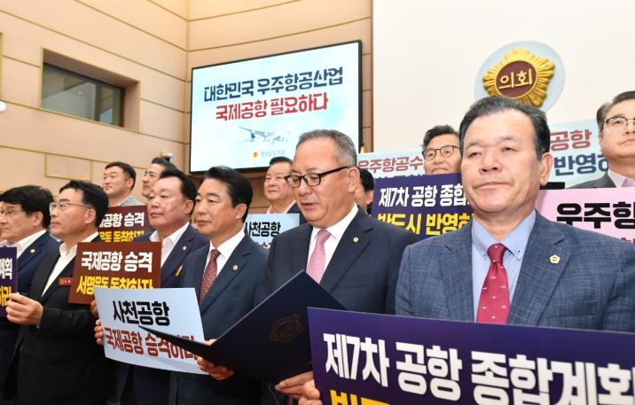 도의회는 성명에서 “우주항공청을 중심으로 사천의 글로벌 우주항공거점 도약을 모색하는 현시점에, 정작 사천공항이 국제공항으로 기능할 수 있도록 국가 차원의 조치가 이루어지지 않고 있다”며, “대한민국 우주항공산업이 글로벌 경쟁에서 뒤처지지 않기 위해서는 사천공항의 국제공항 승격이 필수적”이라고 밝혔다.