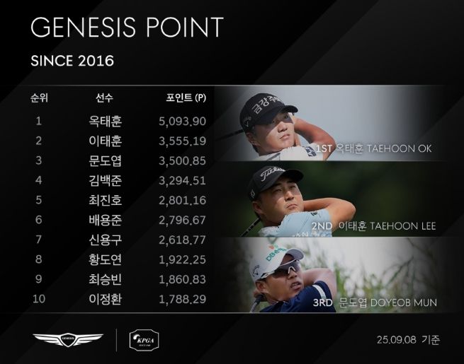 다음 달 23일부터 26일까지는 충남 천안 소재 우정힐스CC에서 KPGA 투어와 DP월드투어 공동주관 대회인 ‘제네시스 챔피언십’이 열린다. ‘제네시스 챔피언십’에는 ‘제네시스 챔피언십’ 직전 대회 종료 기준 제네시스 포인트 상위 36명의 선수가 출전 자격을 얻는다.