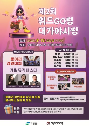 13일 오후 5시부터 고령대가야시장 청년창업공간 일원에서 열리는 ‘위드GO령 대가야시장’에는 대구․경북권 14개 팀이 참가하는 동아리 경연대회를 메인행사로, 인기가수가 함께하는 가을 뮤직페스타, 푸드존, 플리마켓, 고객 체험행사 등 다양한 볼거리와 즐길 거리로 채움으로써 초가을 밤을 지역과 세대를 뛰어넘는 지역민의 재능과 열정, 화합의 장으로 가득 채울 예정이다.
