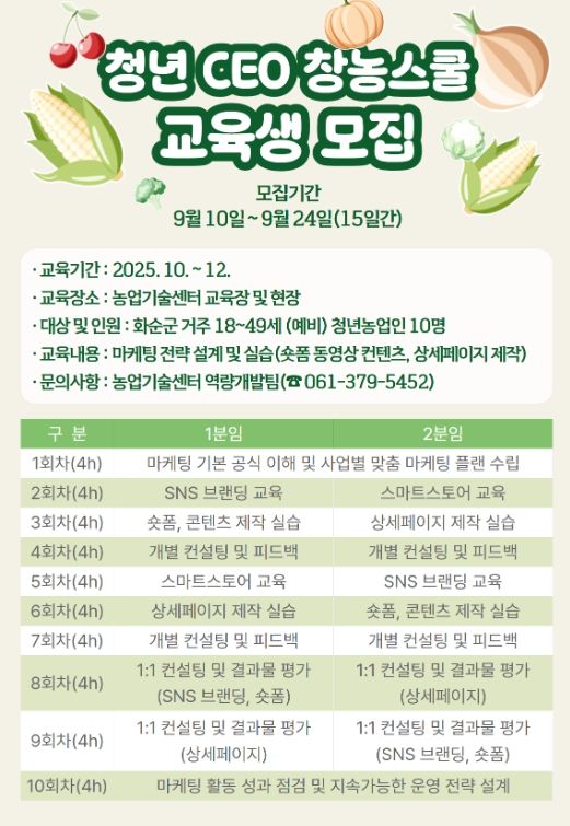 내고향뉴스 관리자 기자 | 화순군은 지역 청년농업인의 창의적인 경영 역량 향상을 위해 ‘청년 CEO 창농스쿨’ 교육생을 9월 10일부터 24일까지 15일간 모집한다고 밝혔다.