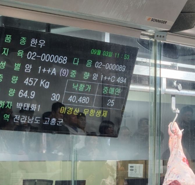 고흥에서 출품한 미경산우는 도체중 457kg, 등심단면적 150㎠, 근내지방도 10점이라는 우수한 성적을 기록하며 1++A 등급을 받았다.