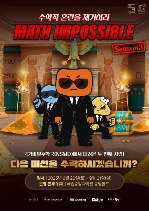 행사는 오는 9월 20일부터 21일까지 이틀간 국립중앙과학관 전역에서 진행되며, 참가자는 ‘수학비밀요원’이 되어 과학관 곳곳에 준비된 임무(미션)를 해결해 나간다. 이집트, 그리스·로마, 문예 브흥기(르네상스) 등 고대 문명부터 시작된 수학적 유산들을 주제로 한 다양한 수학 문제가 준비되어 있으며, 단순한 문제 풀이를 넘어 다빈치 다리 조립과 같은 체험형 임무(미션)도 포함된다. 모든 임무(미션)를 완수한 참가자에게는 특별 제작된 사진 카드(포토카드) 기념품(굿즈)이 선착순으로 제공된다.