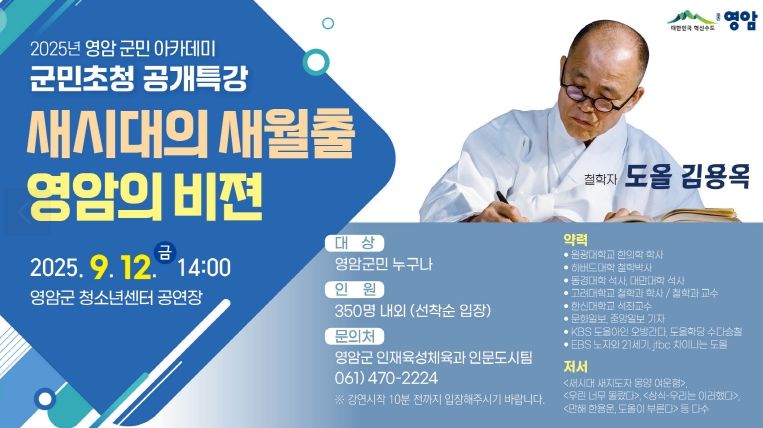 12일에는 도올 김용옥 교수가 청소년센터 공연장에서 ‘새시대의 새월출 영암의 비젼’을 주제로 특별강연을 열고, 이어 12~14일 김창조 산조 페스티벌이 가야금산조기념관과 도갑사에서 개최된다.