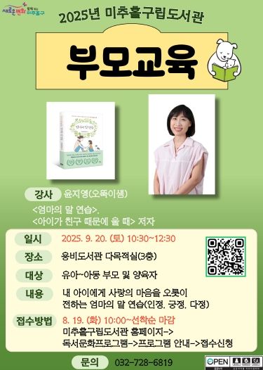 내고향뉴스 관리자 기자 | 인천 미추홀구 구립도서관은 오는 20일 용비도서관에서 영유아와 초등 자녀를 둔 부모 및 양육자를 대상으로 ‘북스타트 부모 교육’을 운영한다.