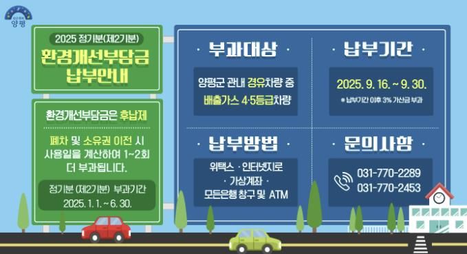 내고향뉴스 관리자 기자 | 양평군은 2012년 9월 이전에 출고된 노후 경유 자동차(배출가스 4·5등급) 3,825대에 대해 제2기분 환경개선부담금 1억 2,740만 원을 부과한다고 밝혔다.