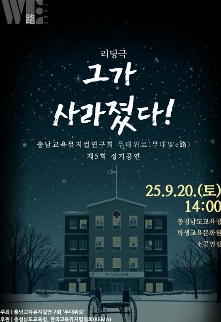 내고향뉴스 관리자 기자 | 충남교육청은 오는 9월 20일 오후 2시, 충청남도교육청학생교육문화원 소공연장(천안)에서 충남교육뮤지컬연구회 ‘무대WE路(무대위로)’의 제5회 정기 공연 ‘리딩극 그가 사라졌다!’를 개최한다.