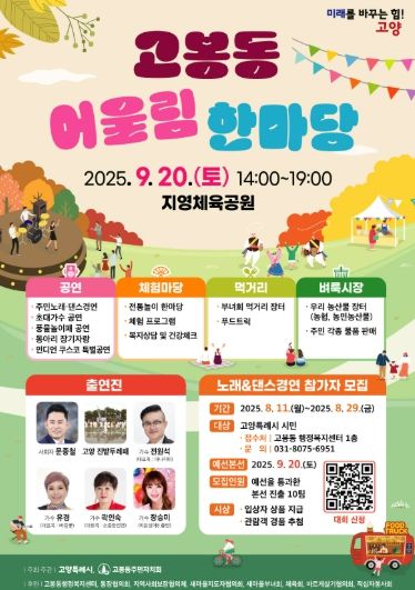 내고향뉴스 관리자 기자 | 고양특례시 일산동구 고봉동 주민자치회는 오는 20일 오후 2시부터 7시까지 지영체육공원에서 ‘제1회 고봉동 어울림 한마당’을 개최한다고 밝혔다. 이름처럼 ‘어울림’이 핵심이다. 세대와 세대, 이웃과 이웃을 잇는 신나는 마을축제가 펼쳐질 예정이다.