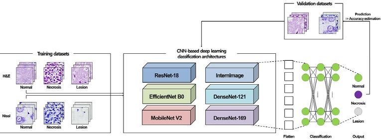 연구진은 뇌졸중을 유발한 전임상 동물모델의 뇌 조직 병리염색 영상에서 뇌졸중 병변과 괴사성 세포가 존재하는 영역을 탐지·분류를 위한 알고리즘에 가장 최적화된 딥러닝 영상 분류 모델들을 적용, 성능을 비교 분석했다.
