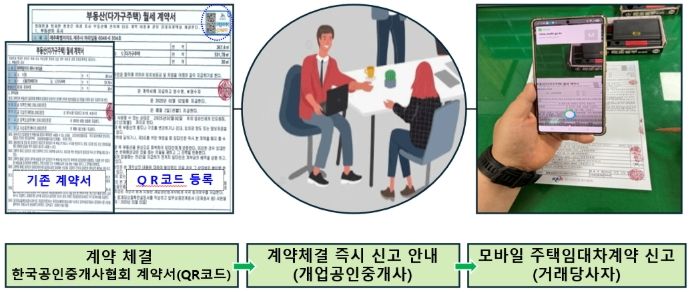 새 제도는 공인중개사가 임대차계약서를 작성할 때 자동으로 삽입되는 큐알(QR)코드를 스마트폰으로 스캔하면 계약 체결과 동시에 바로 신고할 수 있도록 지원한다.