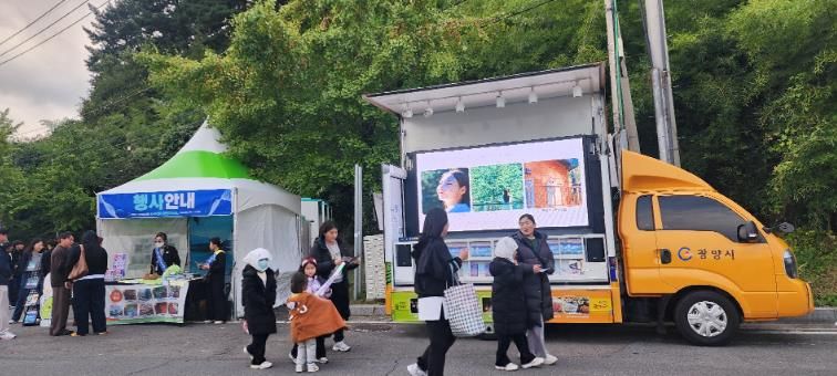 이동형관광안내소는 따스한 광양 햇살의 느낌을 살린 노란색 차량에 광양관광 이미지를 랩핑하고 홍보영상 스크린과 리플릿 비치 기능 등을 도입한 움직이는 관광안내소다.