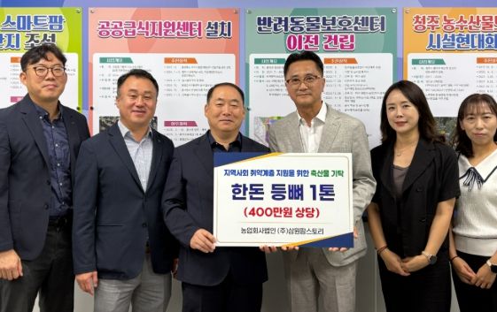 내고향뉴스 관리자 기자 | 청주시 청원구 북이면에 위치한 ㈜삼원팜스토리(대표 서중원)는 10일 청주시청을 방문해 지역 소외계층에게 전달해달라며 한돈 등뼈 1톤(400만원 상당)을 기탁했다.
