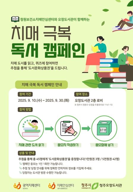 오는 30일까지 오창도서관 2층 로비에서 시민 누구나 캠페인에 참여할 수 있다. 참여자들은 선정된 치매 관련 도서를 읽은 후, 치매 관련 퀴즈를 풀어 응모함에 넣으면 추첨을 통해 소정의 경품을 받을 수 있다.