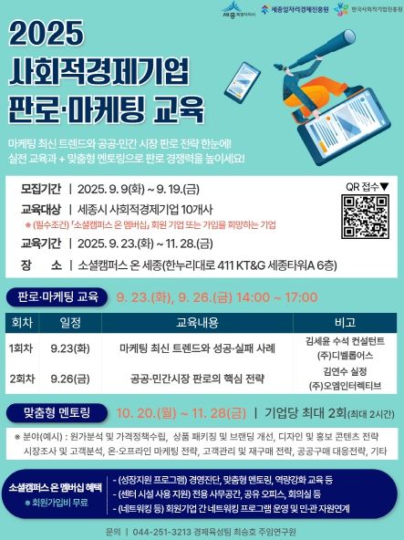 내고향뉴스 관리자 기자 | 세종일자리경제진흥원은 세종시 사회적경제기업의 판로 확대와 경쟁력 강화를 위해 오는 19일까지 ‘2025년 사회적경제기업 판로·마케팅 교육’ 참여기업을 모집한다.