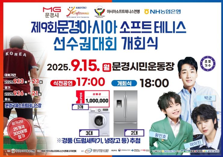 또한, 9월 15일 오후 6시 문경시민운동장에서 열리는 개회식(식전공연 오후 5시 시작)에는 신현국 문경시장, 안도 미츠지 아시아소프트테니스연맹회장, 정인선 대한소프트테니스협회 회장, 임이자 국회의원, 이정걸 문경시의회 의장, 도․시의원 등 내․외빈이 참석하고 마이진, 박군, 황민호 등 인기가수의 축하공연과 불꽃쇼가 펼쳐지며, 추첨을 통해 대형냉장고·드럼세탁기·각종 상품권 등 경품을 제공하여 국제대회를 더욱 빛내고 시민들에게 큰 기쁨을 전달할 계획이다.