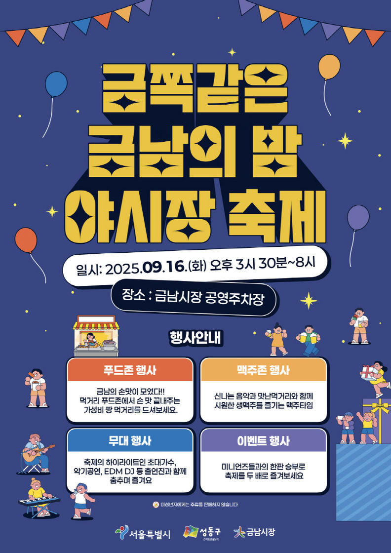 내고향뉴스 고광만 기자 | 서울 성동구 금남시장이 2025년 9월 16일(화) 오후 3시 30분부터 8시까지 특별한 가을밤 축제의 장으로 변신한다.