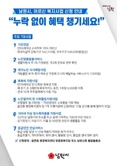 내고향뉴스 고광만 기자 | 남원시는 어르신들의 삶의 질 향상을 위해 다양한 노인복지사업을 추진하고 있다. 특히 신청을 통해 직접 혜택을 받을 수 있는 사업을 적극 홍보하며, 어르신들이 빠짐없이 신청하고 이용할 수 있도록 안내를 강화하고 있다.