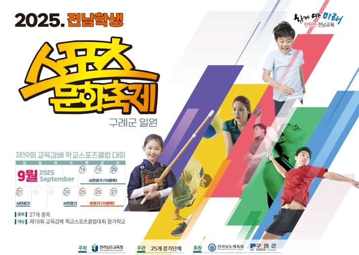 내고향뉴스 채필재 기자 | 전라남도교육청이 주최하는 2025 전남 학생 스포츠 문화축제가 오는 9월 25일부터 9월 27일까지 구례군 일원에서 개최된다.