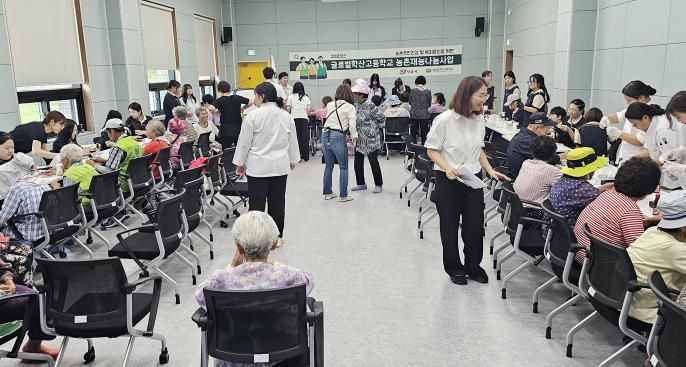 지난 10일 열린 이번 행사에는 글로벌학산고등학교 보건간호과·외식조리과·헤어미용과·미디어콘텐츠과 등 7개 학과 학생 50명과 교사 10명이 참여해 어르신들과 뜻깊은 시간을 나눴다.
