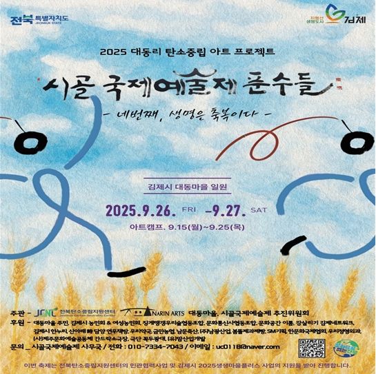내고향뉴스 고광만 기자 | 전북특별자치도와 전북탄소중립지원센터(전북연구원)는 9월 15일부터 27일까지 김제시 만경읍 대동마을에서 '2025 탄소중립 시골국제예술제 푼수들'을 개최한다고 밝혔다.