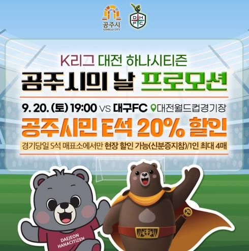 내고향뉴스 고광만 기자 | 공주시는 오는 20일 대전월드컵경기장에서 열리는 대전하나시티즌과 대구축구단의 2025년 K리그1 제30라운드 경기에 맞춰 ‘공주시의 날’ 행사를 연다.