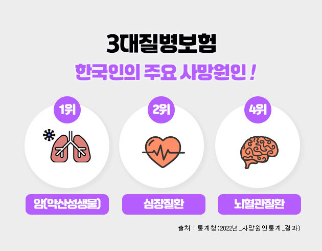 내고향뉴스 고광만 기자 | 흔히 3대질병이라 일컫는 암, 심혈관질환, 뇌혈관질환은 통계청 발표자료에 따르면 한국인의 주요 사망원인 중에서 3위 폐렴을 제외하고 1~4위를 차지하고 있으며, 이전부터 지금까지도 살면서 가장 먼저 대비해야 하는 치명적인 질병으로 강조되고 있다. 이러한 중대질병에 대비하기 위하여 상기 세가지 치명적인 질병을 집중보장하는 3대질병진단비보험을 많이 가입하고 있다. 3대진단비보험은 각각의 질병을 중점적으로 보장하면서도 가입자 특성에 맞는 특약을 추가함으로써 종합건강보험으로도 활용할 수가 있다.
