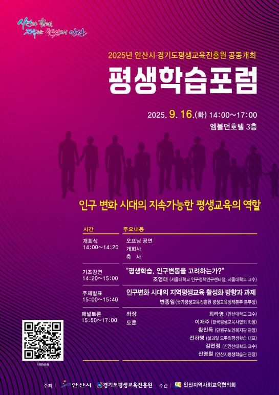 내고향뉴스 채필재 기자 | 경기도평생교육진흥원은 16일 안산 엠블던호텔에서 안산시와 공동으로 ‘인구 변화 시대의 지속가능한 평생교육의 역할’을 주제로 평생학습포럼을 열었다.