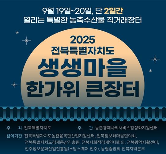내고향뉴스 고광만 기자 | 전북특별자치도는 추석 명절을 맞이하여 도내 우수 농축수산물과 임산물을 한자리에서 만나볼 수 있는 ‘제16회 전북특별자치도 생생마을 한가위 큰장터’를 9월 19일부터 20일까지 이틀간 도청 광장에서 개최한다고 밝혔다.