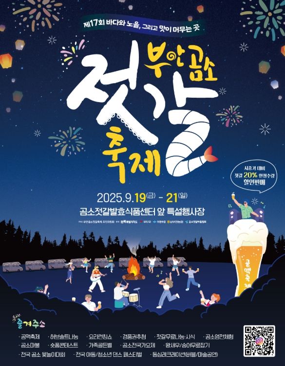 이번 축제는 곰소젓갈센터 앞 특설 행사장에서 '바다와 노을, 그리고 맛이 머무는 곳'이라는 주제로 곰소젓갈을 이용한 먹거리, 볼거리, 즐길거리를 모아 새롭고 흥미로운 경험과 추억을 선사할 예정이다.